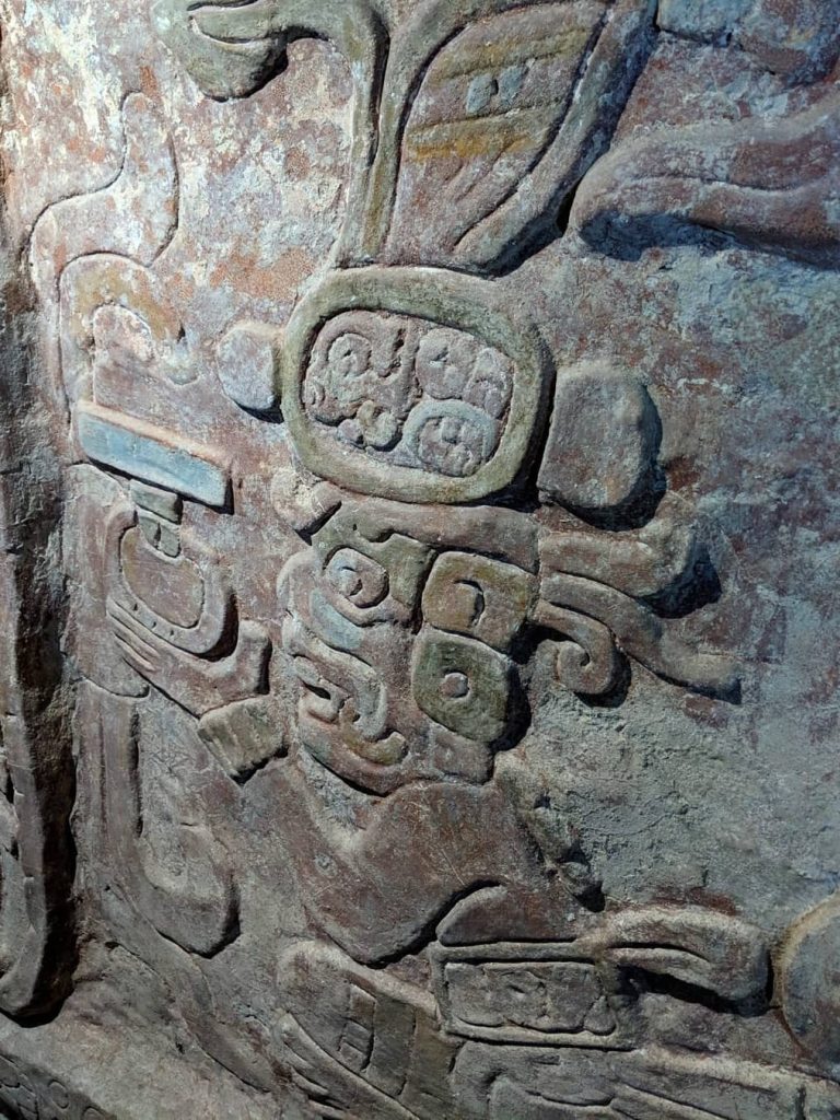 👉 A perfectly preserved stucco frieze depicting Mayan royalty figures and symbolic scenes of great historical value.